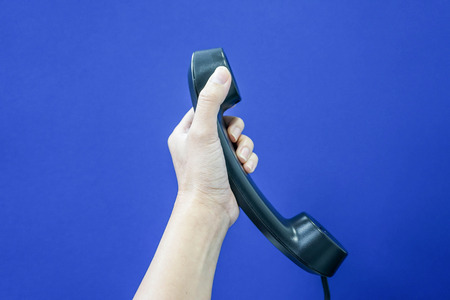 Womans hand holding retro phone receiver. Cropped shot of young lady raising up black landline telephone receiver against khaki green blank copy space background. Customer support service concept