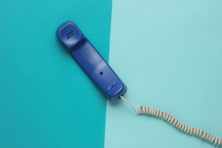 Retro wired handset on classic blue background. Color 2020. Top view.