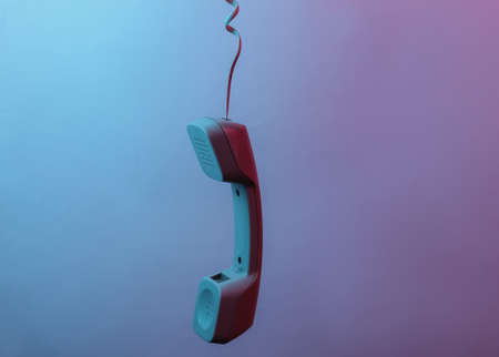 Old fashioned handset. Red-blue neon gradient light. Retro wave, pop culture. Top view