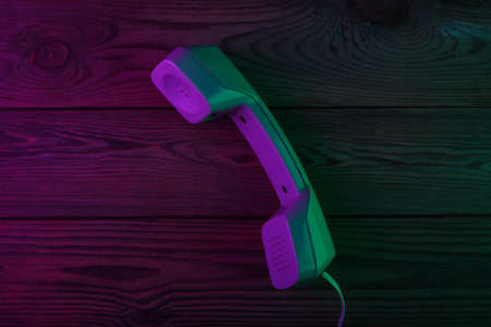Retro telephone handset on wooden background with green magenta neon light. Top view