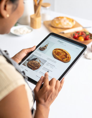 A woman seen from over the shoulder uses a modern tablet to browse an online menu or recipe app.