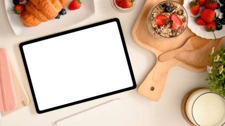 Feminine workspace with pastries concept, Digital tablet blank screen mockup with yummy pastries on table. top view