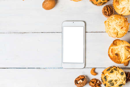 Horizontal phone in womans hands above table with sweet cookies