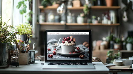 Stylish workspace with laptop displaying dessert and coffee setup