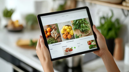 Hands holding tablet displaying online grocery store website, browsing fresh produce and meal options for convenient home delivery
