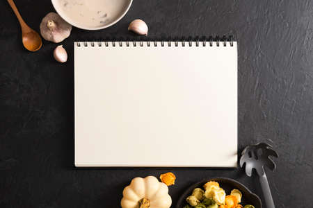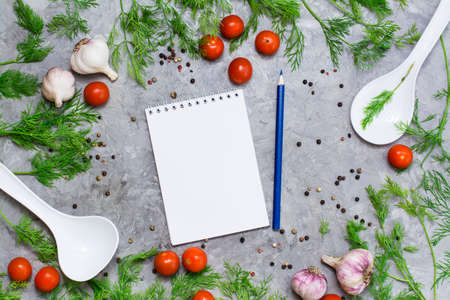 Notebook and pencil for writing recipes surrounded by cherry, dill, pepper spice, garlic and ladles on a gray background. Top view.