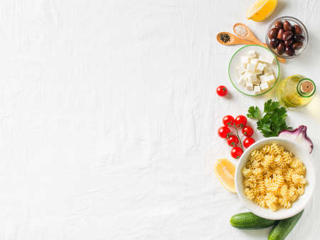Pasta salad in a plate with ingredients on white background
