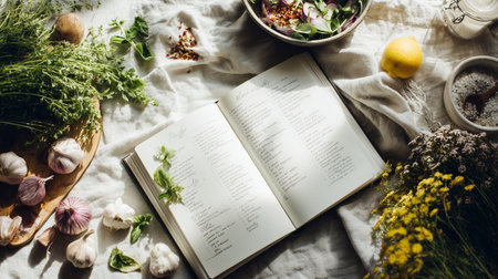 Blank white opened book mockup on a kitchen table surrounded by fresh herbs and food ingredients. AI generative