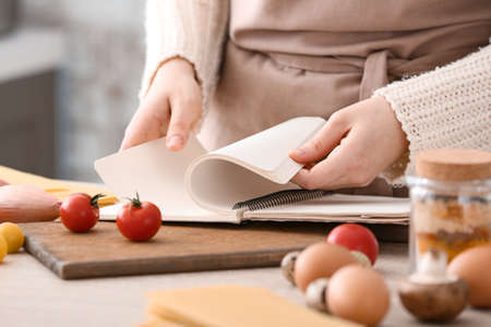 Woman with cook book preparing food in kitchen