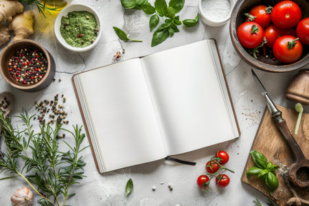 Top view of open blank cookbook with apron, wooden spoon and fresh ingredients of Italian garlic, basil, and organic tomatoes.