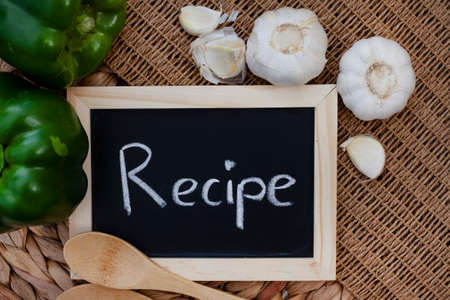 the word recipe written on black chalkboard on rustic setting