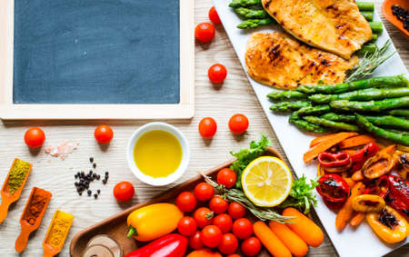Grilled chicken breast with fresh vegetables on wooden background