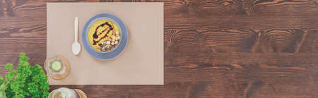 High angle of pumpkin soup in blue bowl, spoon and glass of water with cucumber on wooden table with parsley