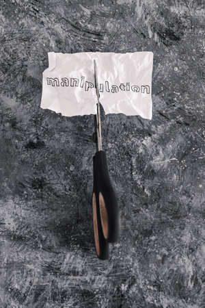 Manipulation text on crumpled piece of paper which is getting cut with scissors, concept of psychology and emotional strength to deal with toxic behaviours
