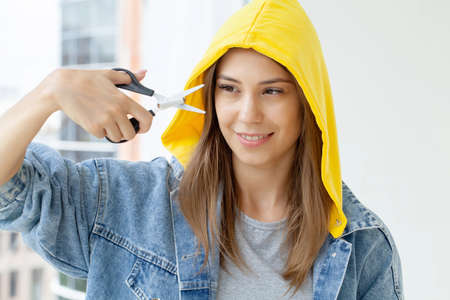 Cutting as a way of healthy strong hair. Girl barber with scissors ready to trimming. Female stylist holds trimmers prepared to haircut.