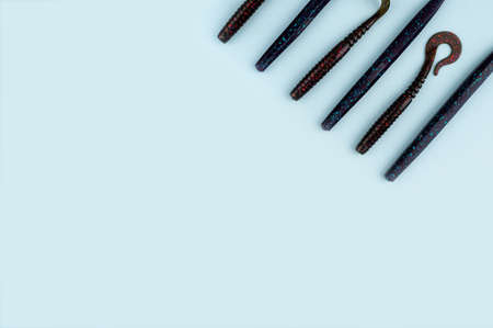 Bass fishing concept on the blue trendy background. Flat lay style. Fishing tackle, soft silicon lures, spinnerbait and wobblers.
