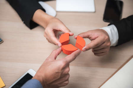 A businessman's hands joining the pieces of a jigsaw symbolizes the merging of two enterprises.
