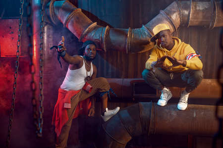 Two stylish rappers dancing in studio