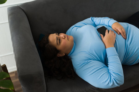 High angle of a depressed sad woman holding her smartphone on the sofa waiting for a text message or call after a breakup