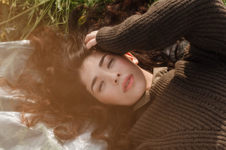 An Asian woman is lying on the ground in a field in a brown sweater. The concept of manufacturing clothing from recycled plastic.