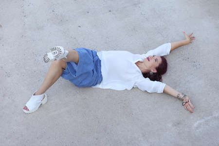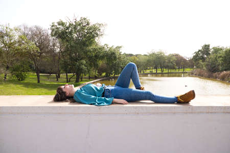 Young asian girl lay down on wall beside lake.