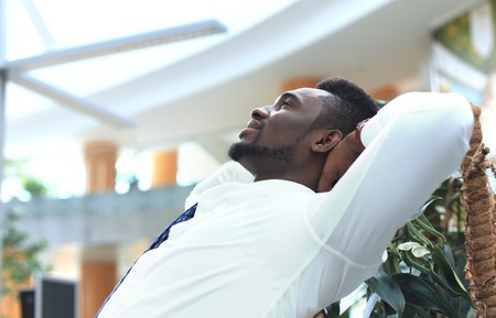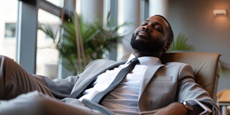 african american businessman in suit relaxing on sofa at modern office