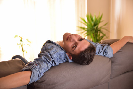 Happy young woman lying on the sofa at home and relaxing, she is smiling and resting with eyes closed