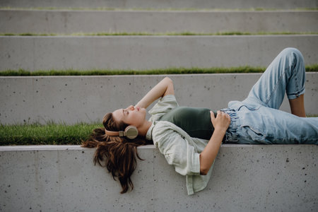 Young woman resting in city park with closed eyes, enjoying music trough headphones.