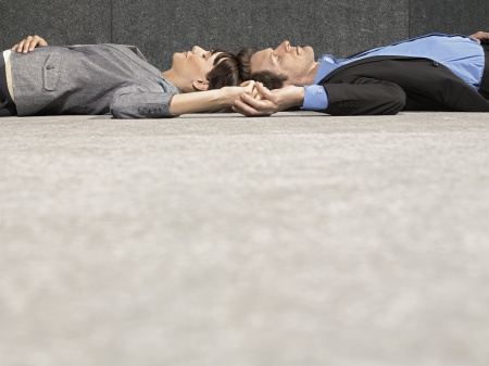 Business man and woman lying on ground head to head holding hands side view