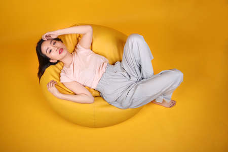 Beautiful young south east Asian woman sits on a yellow beanbag seat orange yellow color background pose fashion style elegant beauty mood expression rest relax think emotion sleep top view