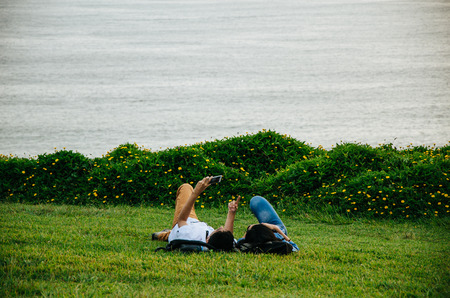 A couple lying on the lawn taking selfies