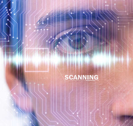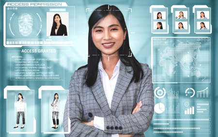 Facial recognition technology scan and detect people face for identification . Future concept interface showing digital biometric security system that analyze human face to verify personal data .