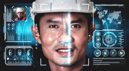 Facial recognition technology for industry worker to access machine control . Future concept interface showing digital biometric security system that analyze human face to verify personal data .