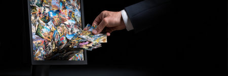 A hand dressed in formal attire is actively putting colorful postcards into a dark box, showcasing an artistic blend of travel and memories in a modern context.