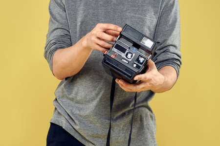 Hands of a person in a yellow sweater with a retro camera in their hands.