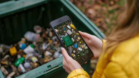 Person using a smartphone to capture photo of litter in recycling bin at a park in autumn