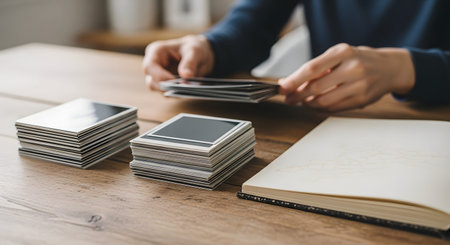 Hands sorting through a stack of instant film photos on a wooden desk next to a notebook. The scene suggests memory keeping, selecting images for an album, or reviewing a photography collection.