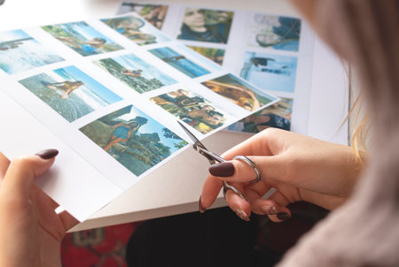 A woman cuts out photos with people in close-up. A girl uses scissors to cut printed photos for an album. A person holds a photo in his hands against the background of other photos.