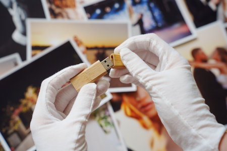Wooden USB flash drive in hands in white gloves and printed wedding photos.