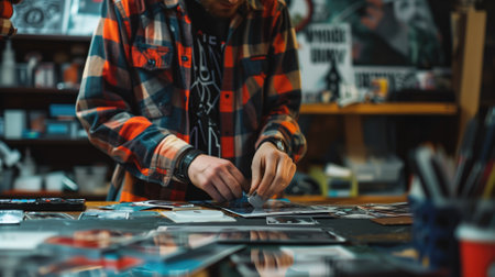 top view of the hands of a woman making a selection of pictures on a selection process of images on a desk after a photoshoot - focus on the center of the image