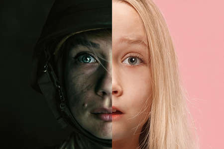 Collage. Half-faced portraits of young woman in military uniform and little girl, child with scared emotions