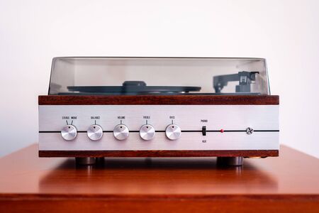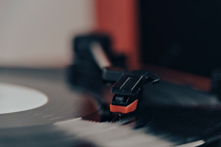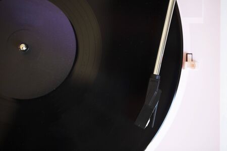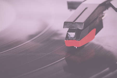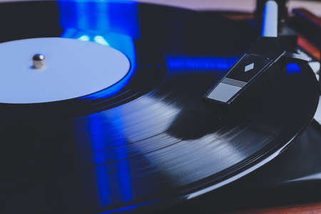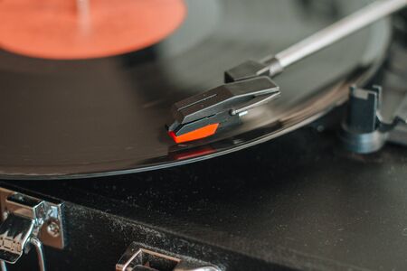 Close-up of modern turntable vinyl record player with music plate. Needle on a vinyl record. Concept of sound technology audio equipment