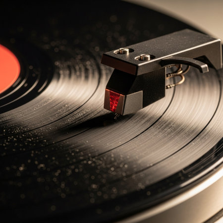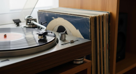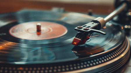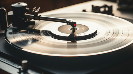 Close-up of a turntable playing vinyl record, capturing the essence of retro music