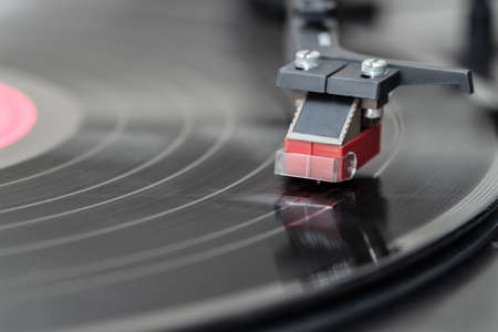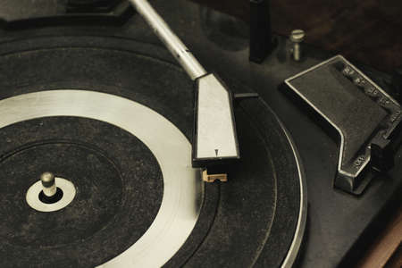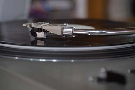 Selective focus on the turntable head located on the music record. The music board rotates and makes music.