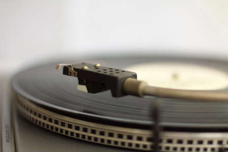 Record player stylus on a rotating disc, Picture of a vinyl record playing.