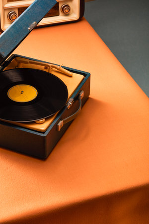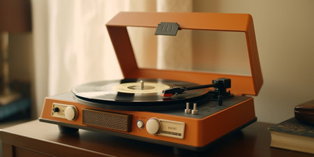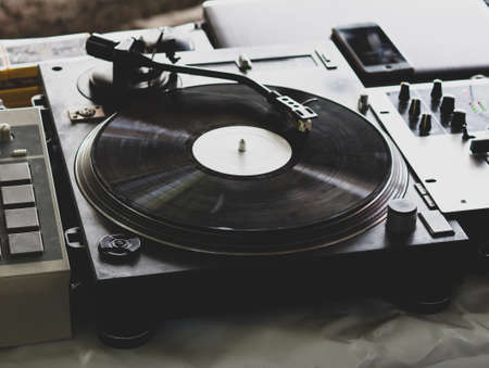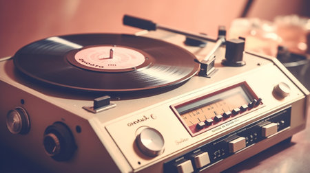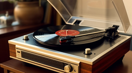 Close up of a vintage record player playing a vinyl record, creating a nostalgic atmosphere