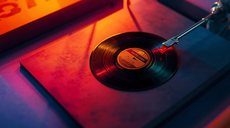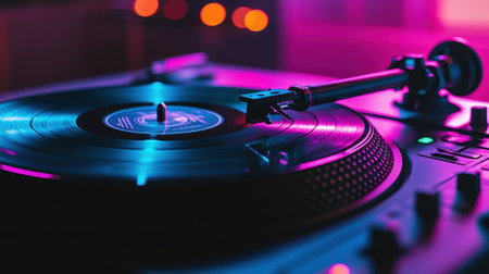 A vinyl record spins on a sleek turntable, with the stylus delicately poised over the grooves, filling the retro music studio with rich sound. Colorful lights illuminate the background, enhancing the nostalgic atmosphere.