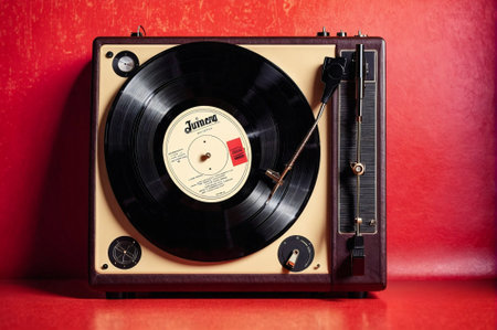 Vintage red vinyl record playing on turntable with needle. ai generated