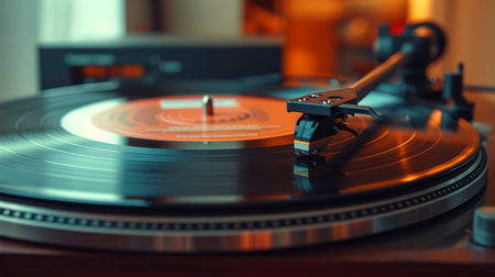 A close-up shot of a vintage record player spinning a vinyl record, with warm lighting and nostalgic decor, capturing the charm of analog music playback.