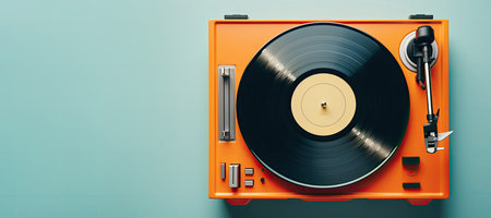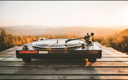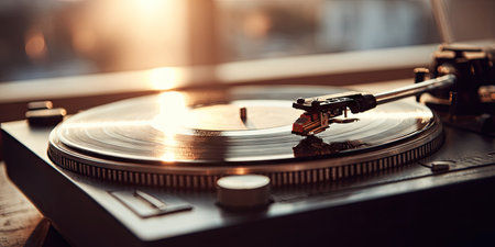 An overhead close-up showcases a classic record player with a vinyl record. Warm sunlight bathes the scene, highlighting the turntable's details. The image features a shallow depth of field, with soft focus in the background. Suitable for conceptual illustrations related to music, audio, or entertainment.